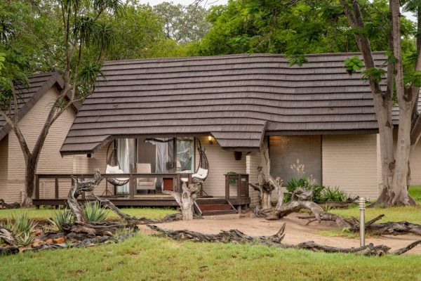 Guests can stay in a choice of six stylish, comfortable en-suite thatched chalets, a family chalet that sleeps four or the luxurious honeymoon suite. Some of the chalets face the watering hole and all have ceiling fans (no air-conditioning). The lodge and its suites are decorated in natural wood tones with rustic wood furniture. The suites' cool stone floors and a light breeze through the mosquito proofed windows ensure a welcome refuge from the African heat. The chalets have an inside and outside shower as well as a wonderful, deep round bath to relax in.