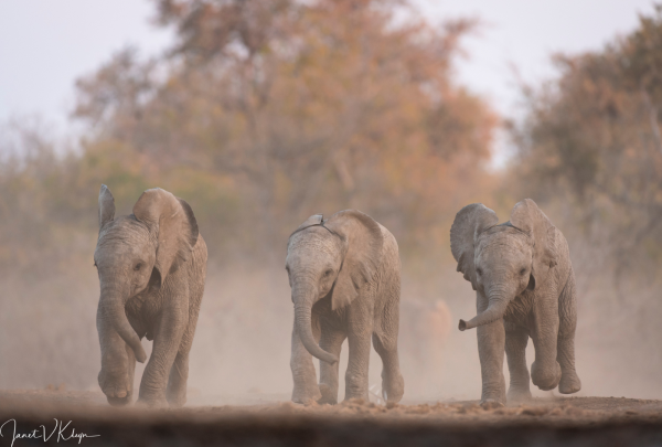 Elephant calves rushing to the water