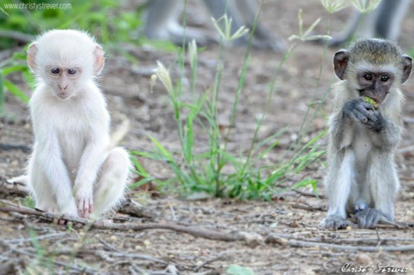 On her way through South Africa's Timbavati Private Game Reserve, Christy Strever spotted a troop of vervet monkeys playing in the road when a monkey as white as snow dashed out from the bushes on the side of the road.