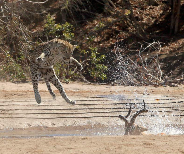By all accounts, the "De Laporte Female" has adopted and perfected this killing method which has been witnessed at least three times that we're aware of. Our head guide, Simon Vegter, has been lucky enough to witness and photograph it twice. The first time, the leopard, unfortunately, lost her kill and barely escaped with her life when a pride of lion happened by and heard the commotion, stealing the prey for themselves as can be seen in this video.