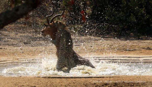 For over an hour, they sat patiently, watching and waiting for the almost inevitable … and then it happened. While the other impalas were chasing each other around, a single ram strutted out towards the water and the leopard sprang into action, making a spectacular kill in the waterhole itself.