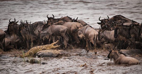The frantic sound of thundering hooves and churning water. The frenzied sight of hoards of wildebeest urgently trying to get to dry land on the other side of the river. The terrifying odds of falling prey to crocodiles lying submerged in the water and big cats lurking in the riverine shrubs, waiting for the right moment to strike.